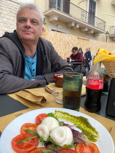 Walking back along the city wall, looking out to sea, we picked up lunch at a cafe called La Ciclatera Sotto Il Mare - John with the local pasta and Liz with a caprese salad with fantastic fresh mozzarella balls, plus the local speciality - small dried rings of some kind of salty dough, which were delicious.