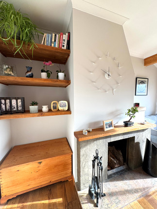 The living room has kind of been put off because it was going to be a lot of work. When thinking about the painting there is the window, the sliding door, the inner door and the feature glass panels, as well as the hatch and fire place to edge round. Then it is quite a big room so the walls and ceiling were going to take time. I had to shift all the furniture round between each coat too. I knew I wanted some shelves up so I could finally unpack the things we have collected on our travels and the family photos. I was also looking forward to finally putting my lovely bird clock up in pride of place on the chimney breast as well. Here are the before pictures.